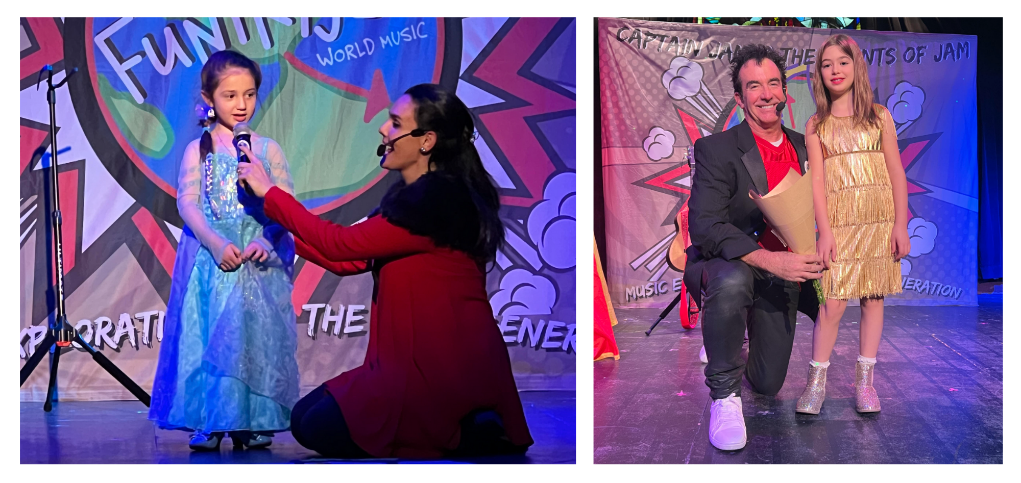 Ana Benchimol & Leila Nashat were recently invited to perform at the FunikiJam Off-Broadway performance. The images show the students singing onstage with microphones, supported by creator and host Brian Barrentine and cultural consultant/teaching artist Beatriz Cavalieri. The event was part of FunikiJam’s family musical series, featuring live music, interactive storytelling, and opportunities for young performers to take the stage in a professional theater setting.